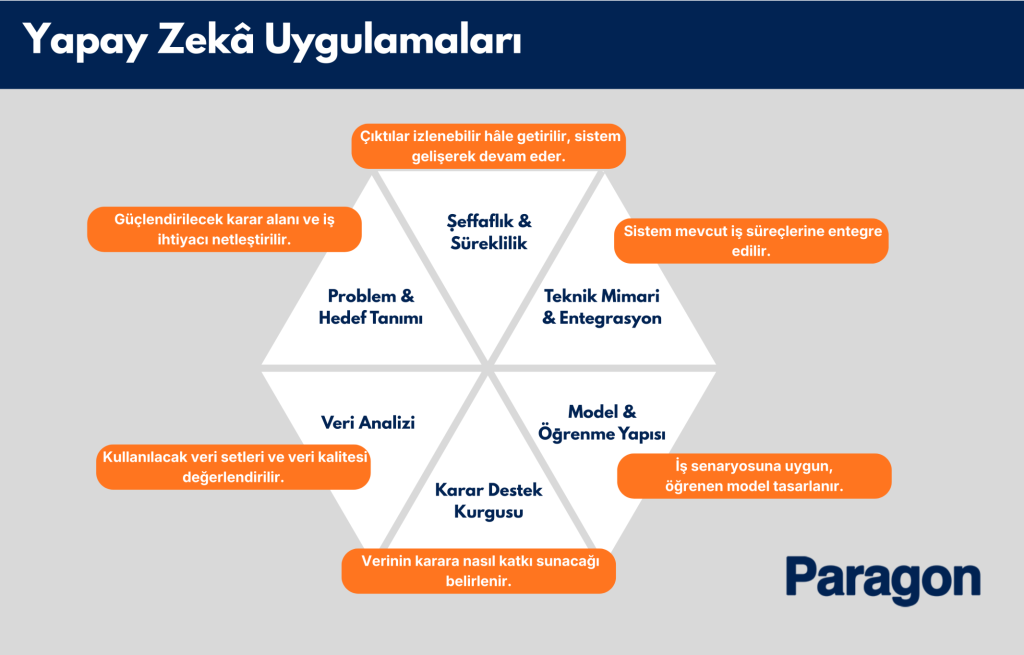 Akıllı uygulama projeleri birçok kuruluş için "yeni bir yazılım geliştirme" çalışmasıdır. Oysa modern yaklaşımda AI projeleri, var olan iş modelini yeniden düşünme ve geliştirme fırsatı sunar. Bu nedenle Paragon Teknoloji, yapay zekâ süreçlerini bütüncül bir yapı olarak ele alır. Her projede öncelikle şu temel başlıklar netleşir: